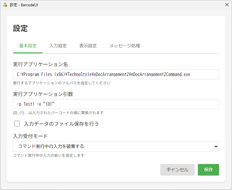 %APPDATA%\TechnoStyle\BarcodeUI\temp\input_data.csvアプリケーション実行中のバーコード入力の扱いを設定します。